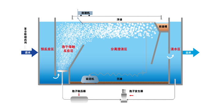 孢子轉(zhuǎn)移技術(shù),是將混凝技術(shù)、氣浮技術(shù)與微納米孢子相結(jié)合,通過定制化藥劑、微納米氣泡與水中的磷、疏水基懸浮物發(fā)生反應,創(chuàng)新形成的一種高效物理化學處理方法。主要解決了目前常用溶氣氣浮技術(shù)在應用過程中存在的處理效率較差、表面負荷較低、處理能耗較高、應急機動性不強等問題。